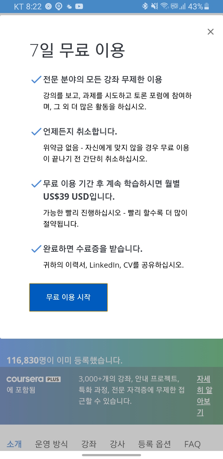 한달 39달러이고 약 6개월 정도 소요되는 과정으로
